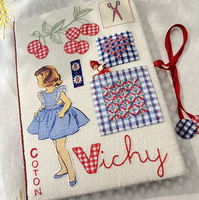Semi kit , avec images à thermocoller, vichy de plusieurs couleurs , galons anciens, galons vichy, lacet et un bouton nacre rouge . Plus explications broderies et montage. Dimensions : 15 cm sur 21 cm